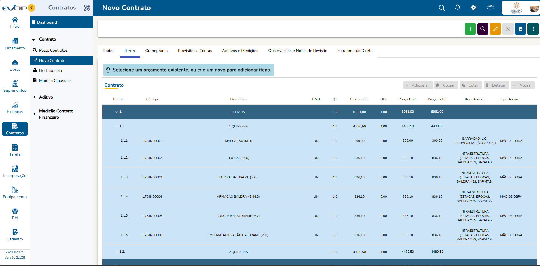 - Parametrize o módulo de contratos e vincule à obra/orçamento.