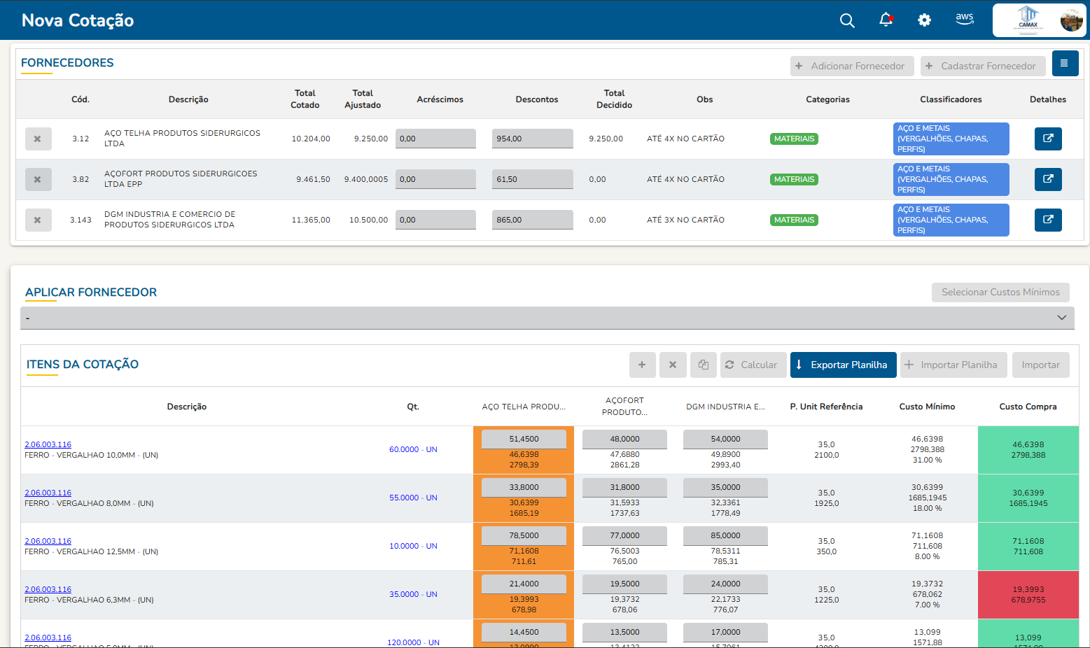 - Cotações simultâneas: compare até 4 fornecedores por item em uma única tela.